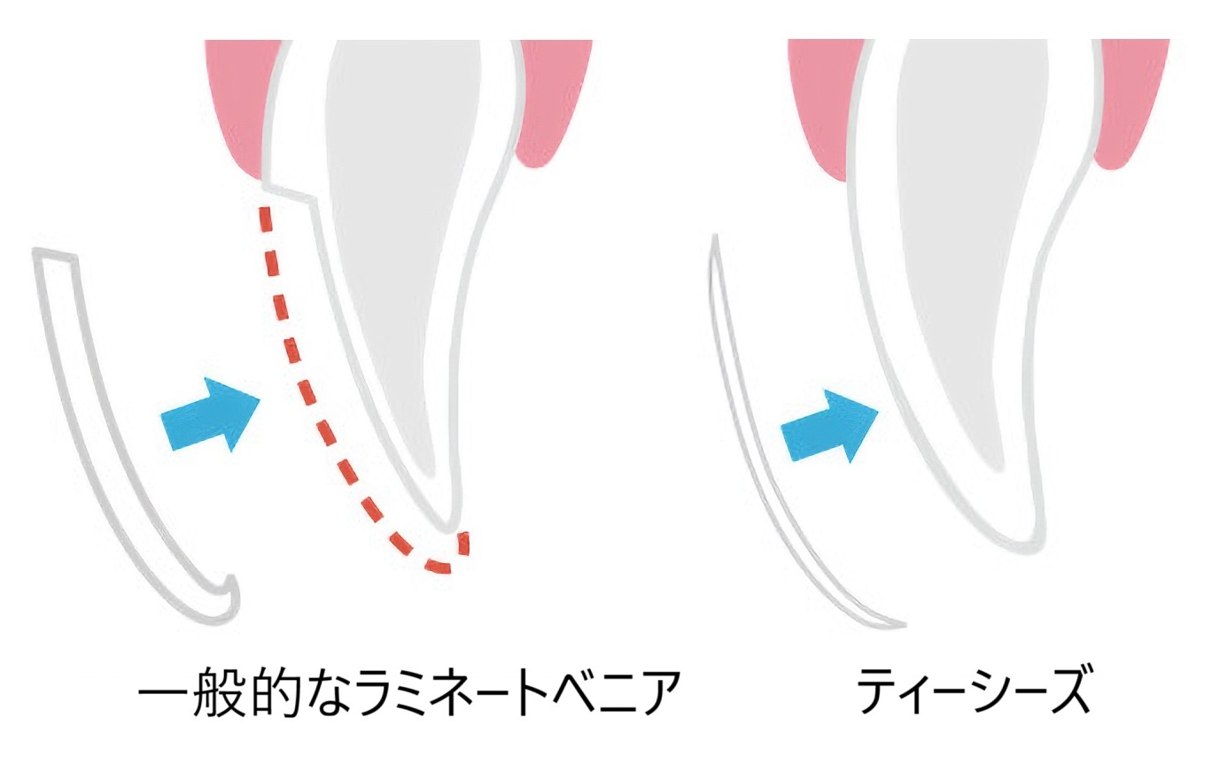 一方で、ティーシーズはコンタクトレンズほど(約0.5mm)の厚みしかなく、通常のラミネートベニアに比べて非常に極薄です。そのため、歯を削らずに、表面にそのまま重ねることができます。